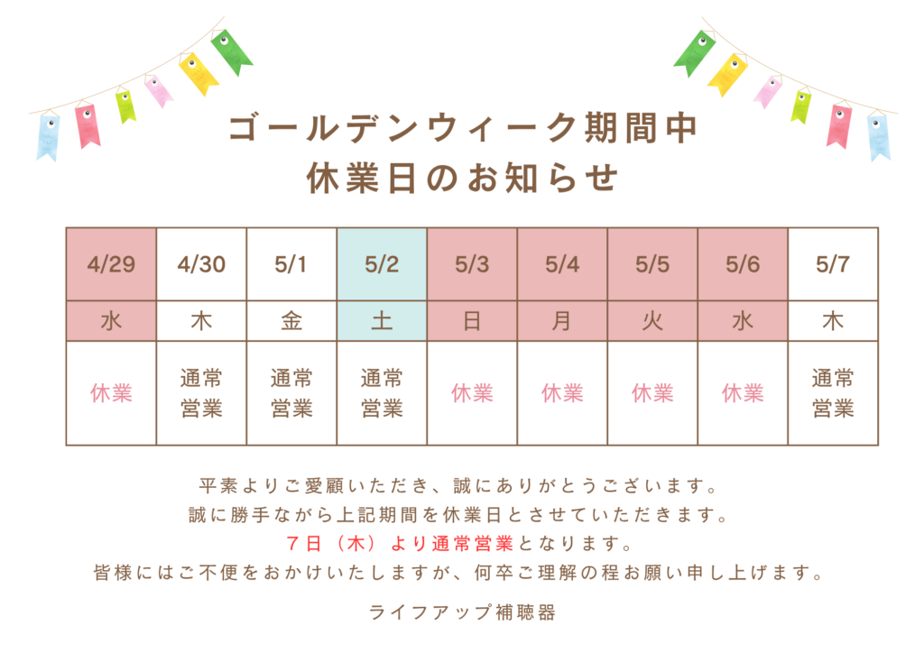 GW期間中のお休みと営業日についてお知らせいたします。